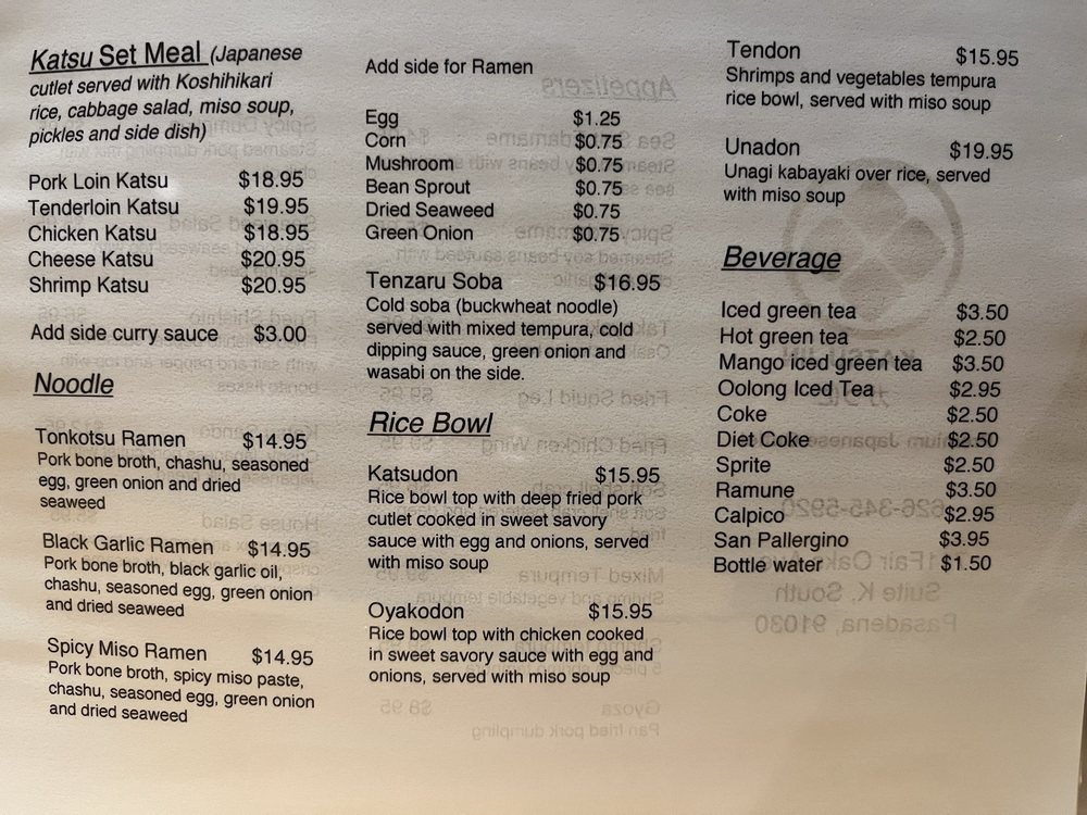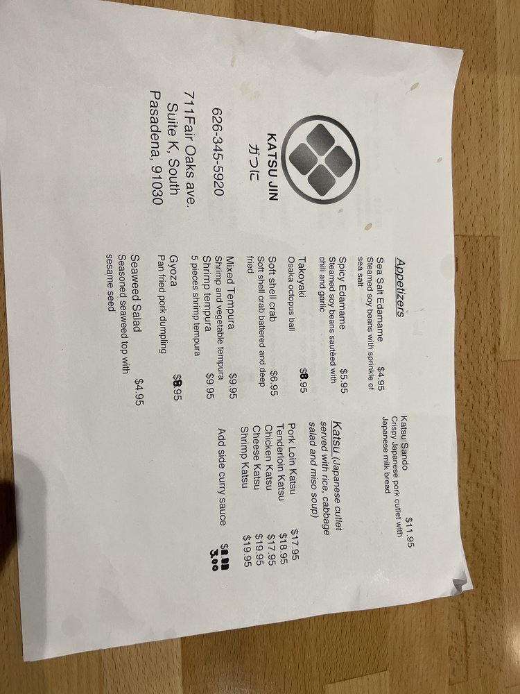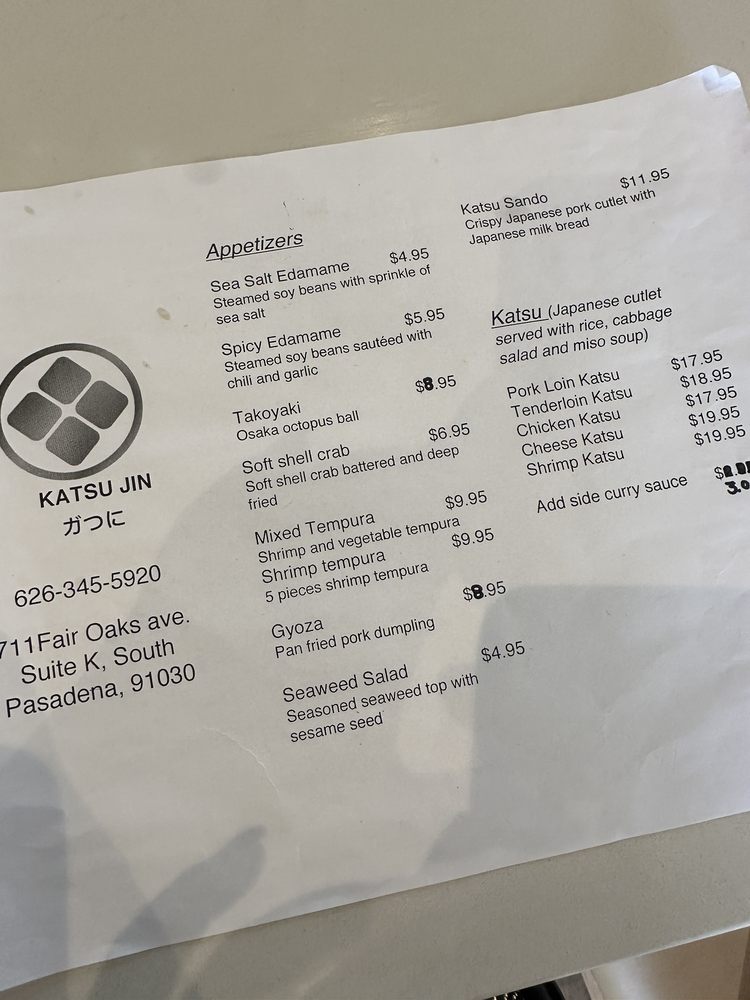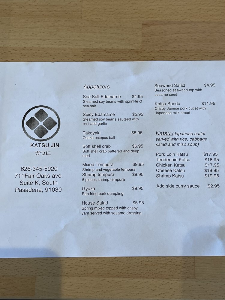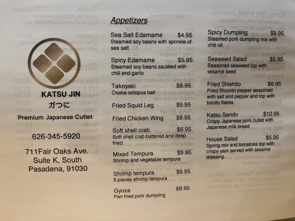 Katsu Jin, located in South Pasadena, offers a casual and trendy dining experience with a wide range of Japanese dishes. The menu features appetizers like Gyoza, and entrees such as Cheese Katsu, Chicken Katsu, and Ramen options like Spicy Miso Ramen. Customers rave about the crispy yet tender Katsu dishes, particularly the Pork Loin Katsu. The restaurant provides a clean and spacious environment, with efficient service and a variety of amenities including outdoor seating, Wi-Fi, and Happy Hour. The Corn Ribs and Cheese Katsu are highlighted as must-try items, with customers praising the flavors and portion sizes. Overall, Katsu Jin is a hidden gem for authentic Japanese cuisine in Pasadena, offering delicious dishes at reasonable prices.